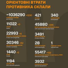 Загальні бойові втрати противника з 24.02.22 по 15.07.25 орієнтовно склали: особового складу ‒ близько 1 036 290 (+1230) осіб;танків ‒ 11 022 (+3);бойових броньованих машин ‒ 22 993 (+6);артилерійських систем – 30 346 (+52);РСЗВ – 1 440...