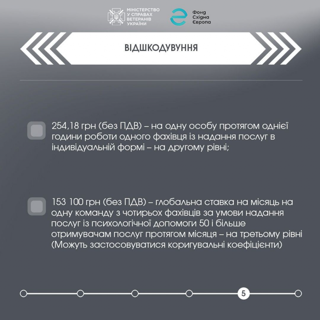 Зокрема, на другому та третьому рівнях Мінветеранів відшкодовує надавачам вартість наданих послуг. Послуги можуть надаватися стаціонарно та/або амбулаторно, та/або дистанційно. Щоб стати надавачем послуг та отримувати відшкодування від Мінветеранів, потрібно подати заяву до Реєстру суб’єктів надання послуг із надання психологічної допомоги для ветеранів та членів їх сімей (для другого та третього рівнів) через “Кабінет надавача“ https://veteranpsycho-help.mva.gov.ua/login.