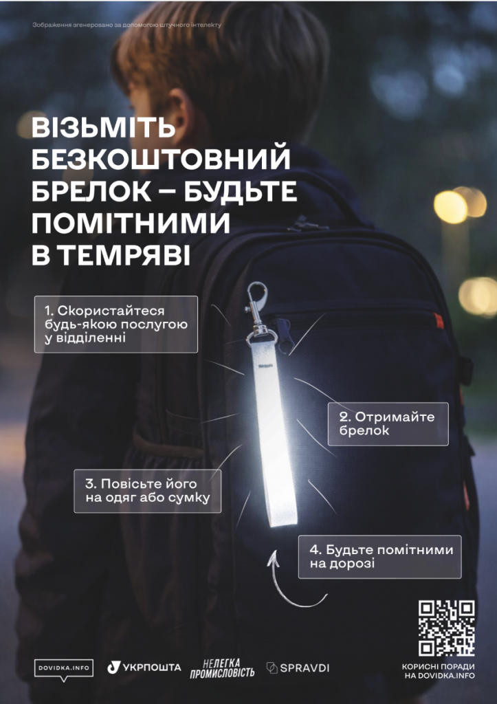 Отримайте світлоповертальний брелок у працівника пошти безоплатно. Також у межах кампанії проєкт Dovidka.info підготував анімаційний ролик про те, чому світлоповертальні елементи є важливою частиною безпеки в темну пору доби. У відео просто і наочно пояснюють, як світлоповертальні елементи допомагають пішоходам бути помітнішими на дорозі.