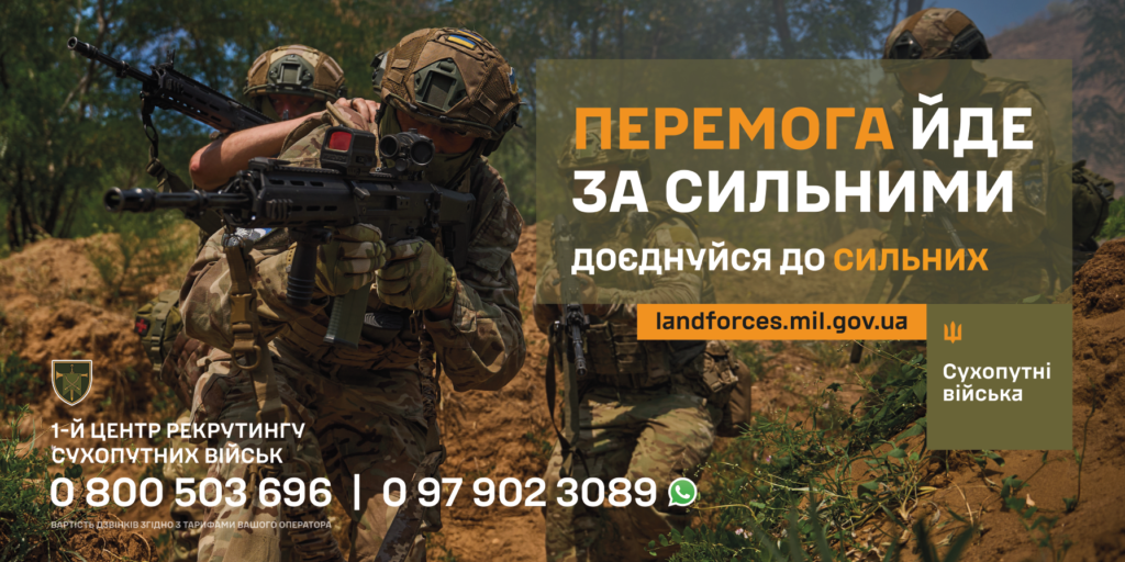 Ми – покоління вибору. Покоління сміливих, дієвих, сильних. Ми будуємо своє майбутнє без страху і боремося, щоб жити у вільній Україні. Ми плануємо, мріємо і віримо – зможемо! Вистоїмо! Переможемо! Долучайся до лав Сухопутних військ через 1-й центр рекрутингу – будь тим, хто надихає і показує: Я МОЖУ ВСЕ!