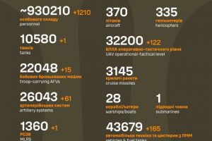 Орієнтовні бойові втрати противника з 24.02.22 по 18.11.25 склали: особового складу ‒ близько 1 160 380 (+960) осіб;танків ‒ 11 355 (+0);бойових броньованих машин ‒ 23 594 (+0);артилерійських систем – 34 499 (+13);РСЗВ – 1 545 (+1);засоби ППО ‒ 1 247...